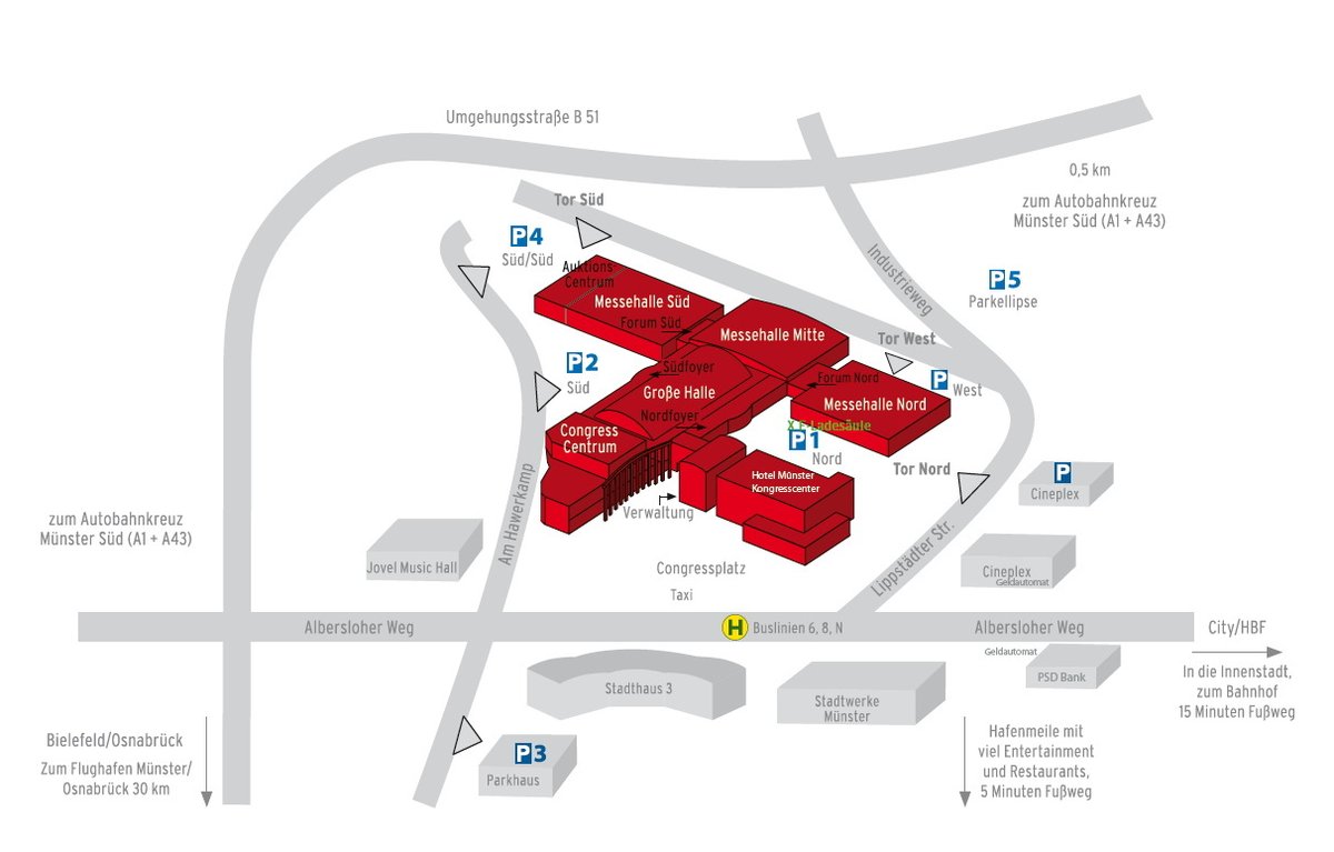 Das Messe und Congress Centrum Halle Münsterland liegt verkehrstechnisch gut erreichbar an den Autobahnanschlüssen der A1 und A43 in Münsters City. Bitte nehmen Sie von der Autobahn die Ausfahrt „Münster Süd“ und folgen dann den Hinweisschildern sowie dem Parkleitsystem. 1.400 Parkplätze stehen Ihnen in unmittelbarer Nähe zur Verfügung.
